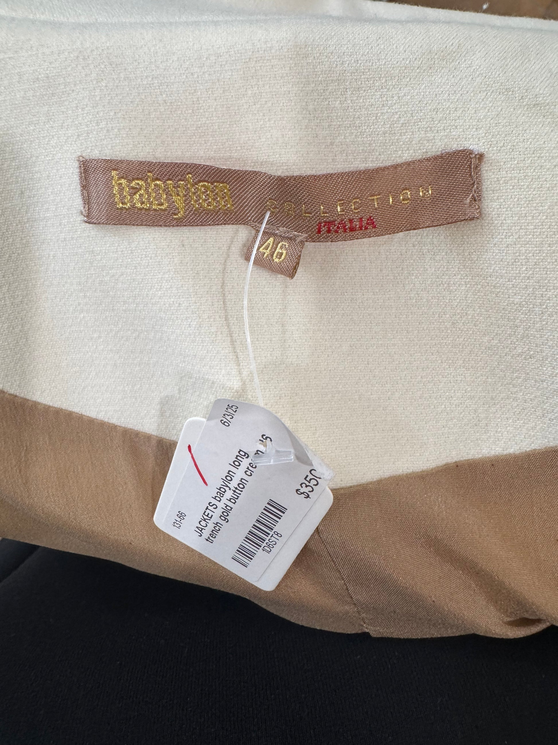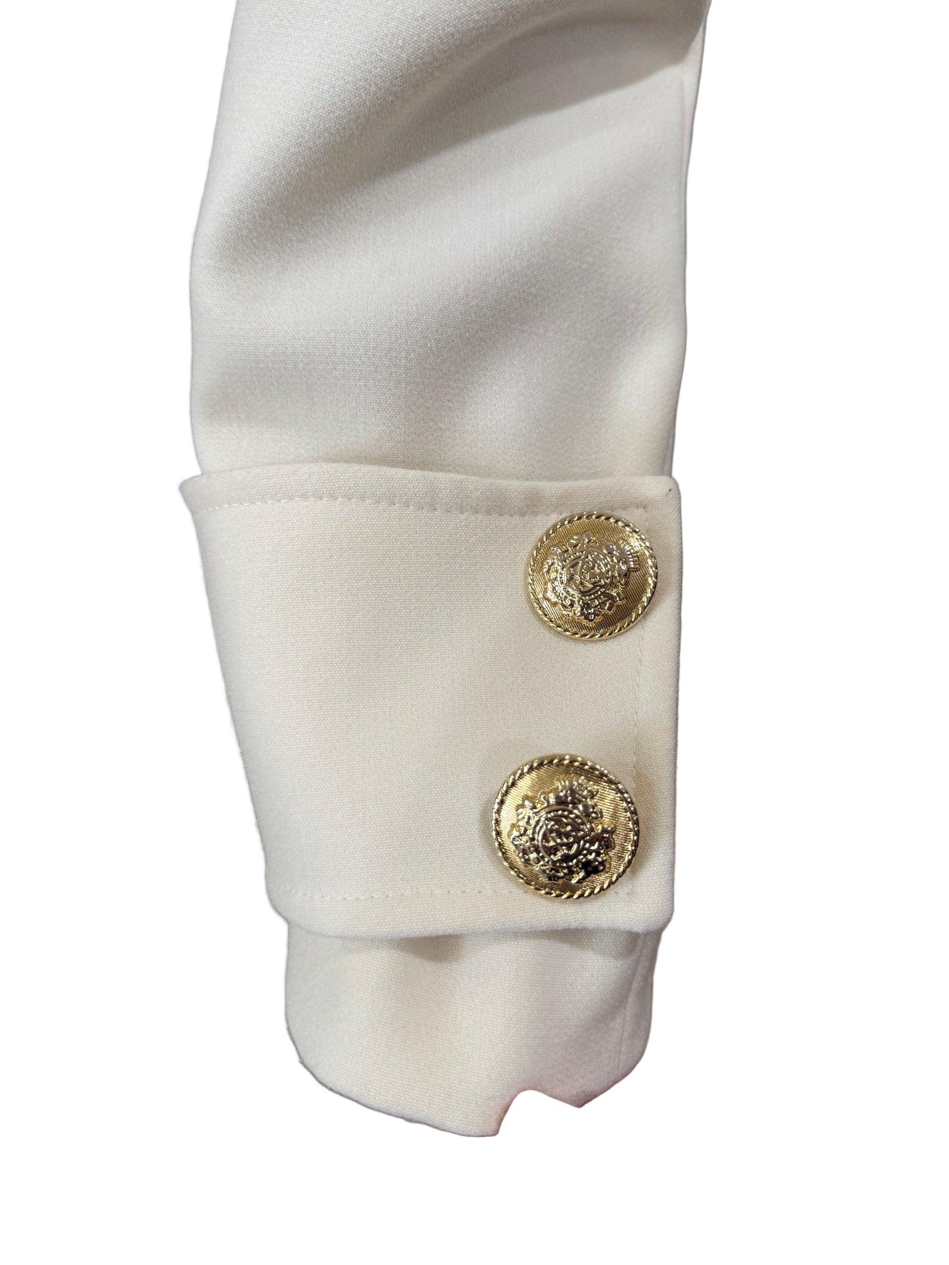 Commanding elegance with a touch of drama, this Babylon coat is designed to turn heads. Crafted in a soft ivory fabric, the tailored longline silhouette is finished with bold, gold-tone embossed buttons for a statement military-inspired look. The structured shoulders, epaulettes, and high collar elevate the design, while practical side pockets and cuff details add refinement. A showpiece coat that blends timeless sophistication with contemporary edge.