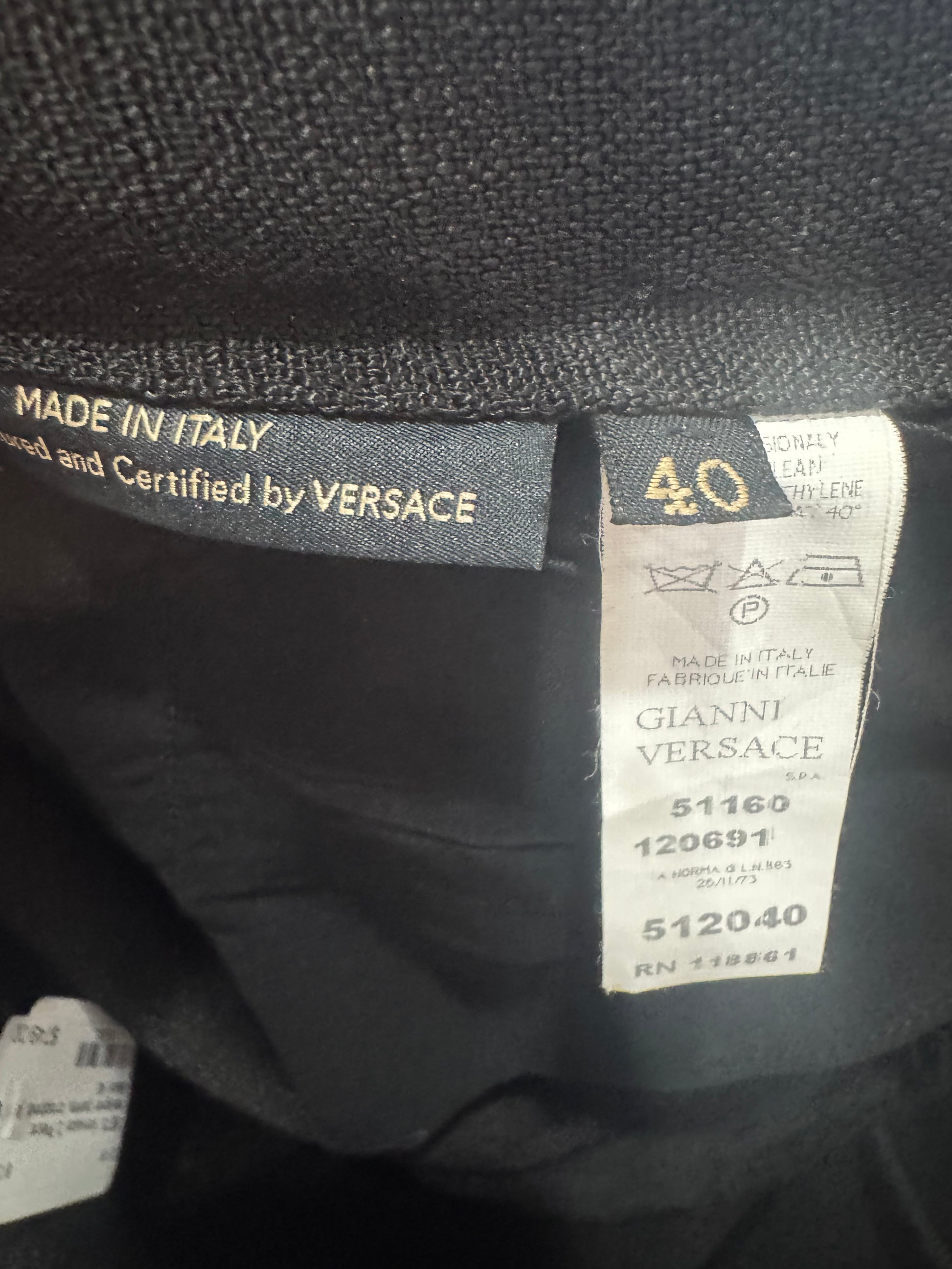 Sleek tailoring meets bold Italian design in this sophisticated Versace pantsuit. The structured jacket features an asymmetric front closure with oversized logo buttons and a high collar for a modern, architectural silhouette. Paired with wide-leg trousers detailed with matching button accents at the waist, this set strikes the perfect balance between power dressing and timeless elegance.